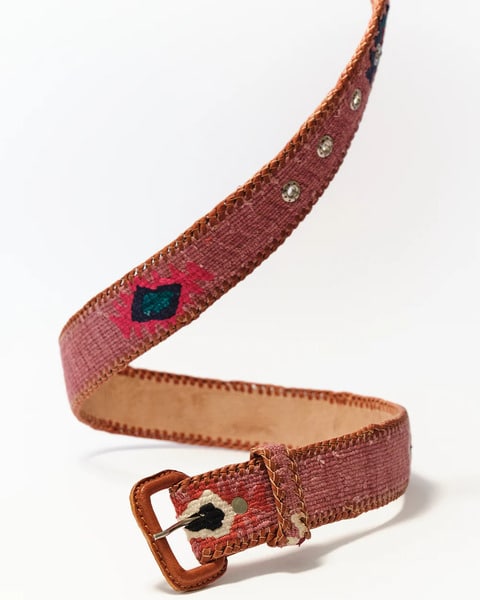 Sobre la base de cuero están tejidos hilos de algodón de colores. Sobre ellos, aparecen decorados étnicos de diferentes colores, aportando vitalidad y originalidad. El acabado lateral del cinturón es un cordón trenzado de piel natural.